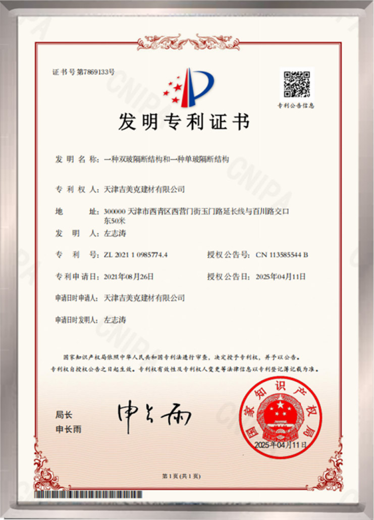 | 2025年4月11日——天津吉美克建材有限公司獲得了國家知識產(chǎn)權(quán)局頒發(fā)的發(fā)明專利證書,發(fā)明名稱是一種雙玻隔斷結(jié)構(gòu)和一種單玻隔斷結(jié)構(gòu)。 |