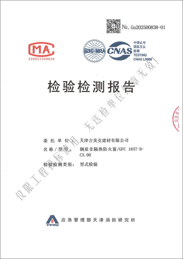 | 本次檢測由具備CMA/CNAS資質(zhì)的第三方檢測機(jī)構(gòu)執(zhí)行,由天津消防研究所出具的報(bào)告,是型式檢驗(yàn)(最高級別的檢驗(yàn)標(biāo)準(zhǔn))。我公司鋼質(zhì)非隔熱防火窗通過應(yīng)急管理部天津消防研究所C類3.00H防火測試 |