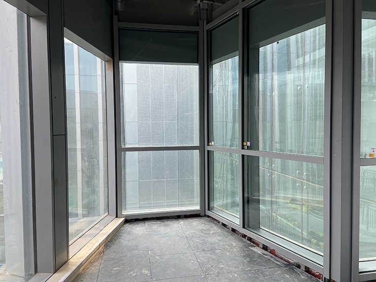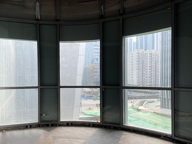 該項目外幕墻采用GMQ防火幕墻系統(tǒng)(滿足防火極限1.0h),共計約524.91平米(平面幕墻與彎弧幕墻)。室內(nèi)防火隔斷采用GMQ防火疊加系統(tǒng),共計160平米,幕墻外立面整體效果簡潔大方,線條規(guī)整,比例勻稱,可視面僅為60mm,可做出超大跨度,在保證高強度和高穩(wěn)定性的基礎(chǔ)上使玻璃面積最大化,采光效果更加。面材采用25mm復(fù)合防火玻璃+LOW-E玻璃,在滿足防火性能的基礎(chǔ)上,還具有優(yōu)異的隔熱、保溫性能,可大大降低因輻射而造成的室內(nèi)熱能向室外的傳遞,可達到理想的節(jié)能效果,實現(xiàn)冬暖夏涼的舒適效果。