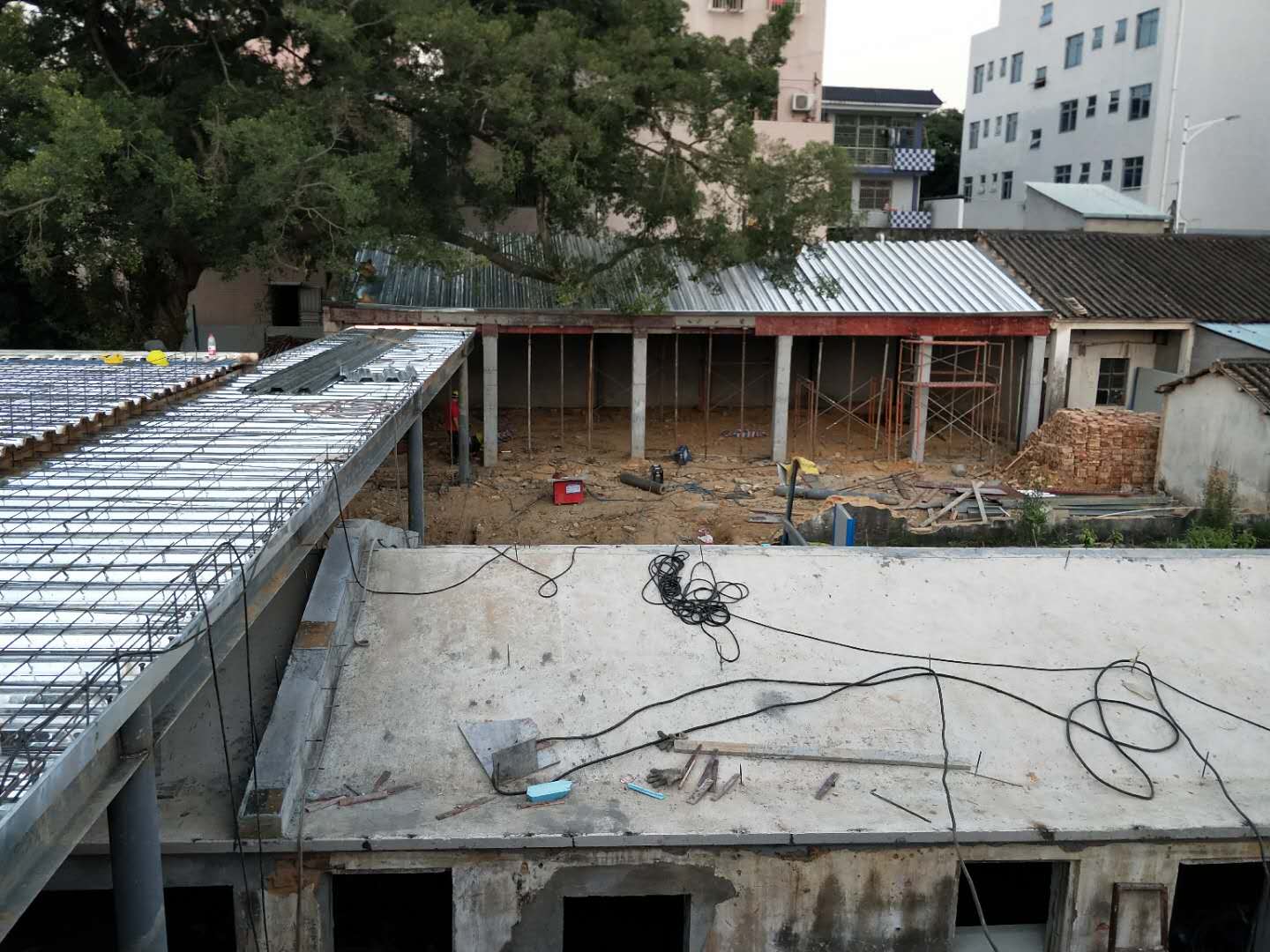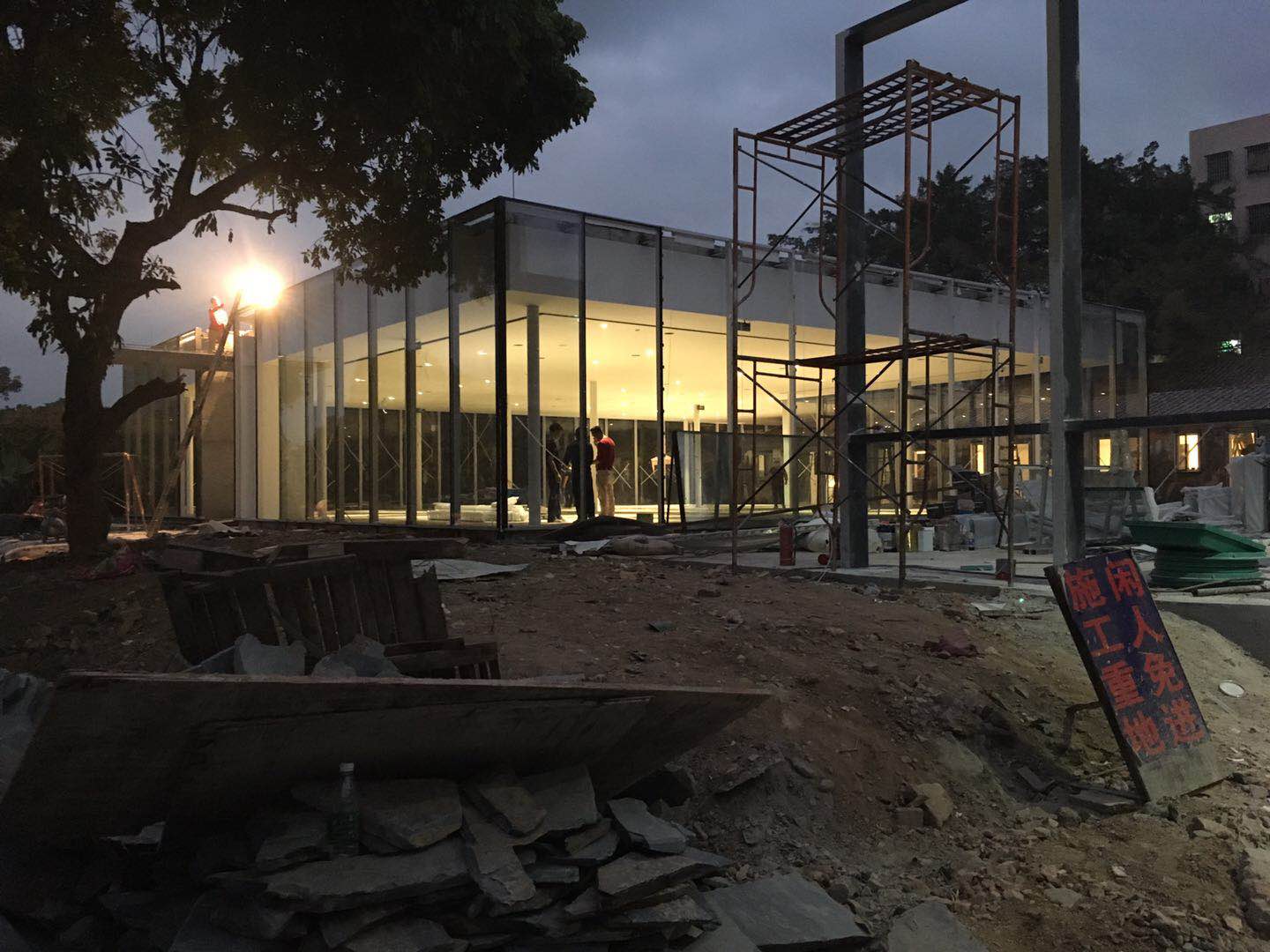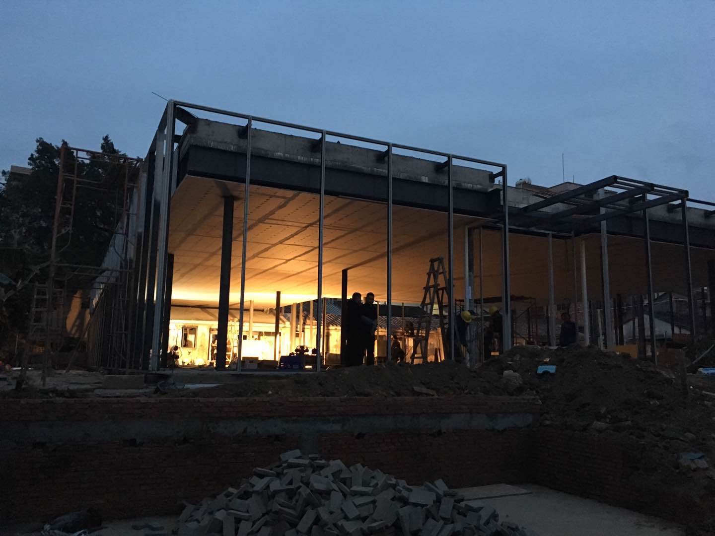 夜幕中還在忙碌的施工人員
