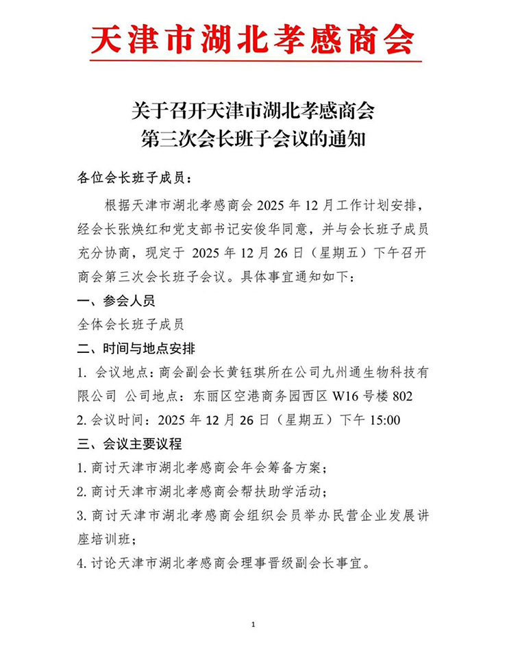 2025 年 12 月 26 日(星期五)天津吉美克建材有限公司總經(jīng)理左志濤先生作為天津市湖北孝感商會(huì)常務(wù)副會(huì)長(zhǎng)參加第三次會(huì)長(zhǎng)班子會(huì)議,其內(nèi)容主要為年會(huì)籌備方案、幫扶助學(xué)活動(dòng)、培訓(xùn)班以及理事會(huì)晉級(jí)副會(huì)長(zhǎng)相關(guān)事宜。