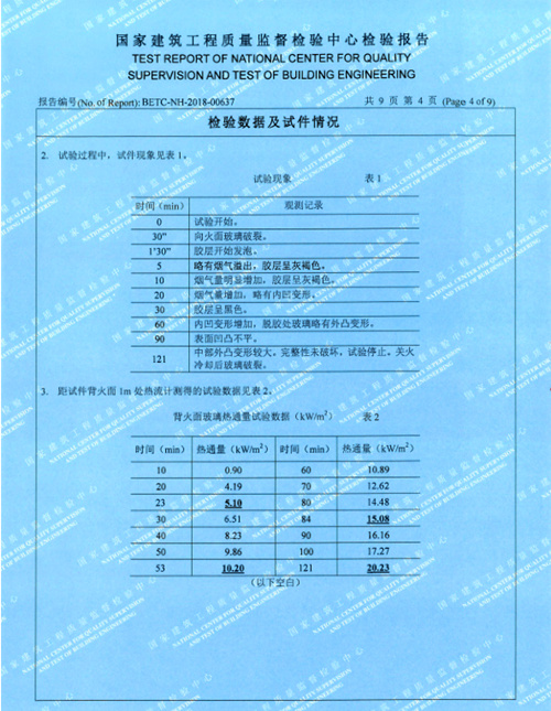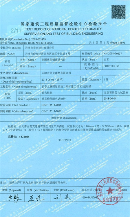 長春龍嘉國際機(jī)場二期擴(kuò)建工程T2航站樓——非隔熱型鑲玻璃構(gòu)件耐火完整性121分鐘檢測報(bào)告