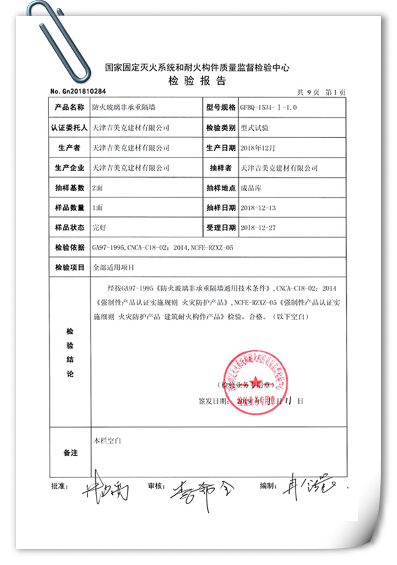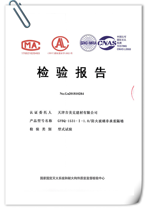 天津吉美克建材有限公司,作為專業(yè)的防火幕墻生產(chǎn)廠家,在保證產(chǎn)品質(zhì)量的同時不斷創(chuàng)新研發(fā),我司A類防火玻璃非承重隔墻(3C強制性認證產(chǎn)品)完美通過1小時耐火完整性及隔熱性型式檢驗,接受真正的行業(yè)考驗。
